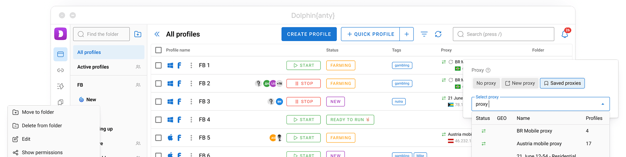 Group by niches, status and any other criteria. Use the layout, icons and color indication to quickly find browser profiles.